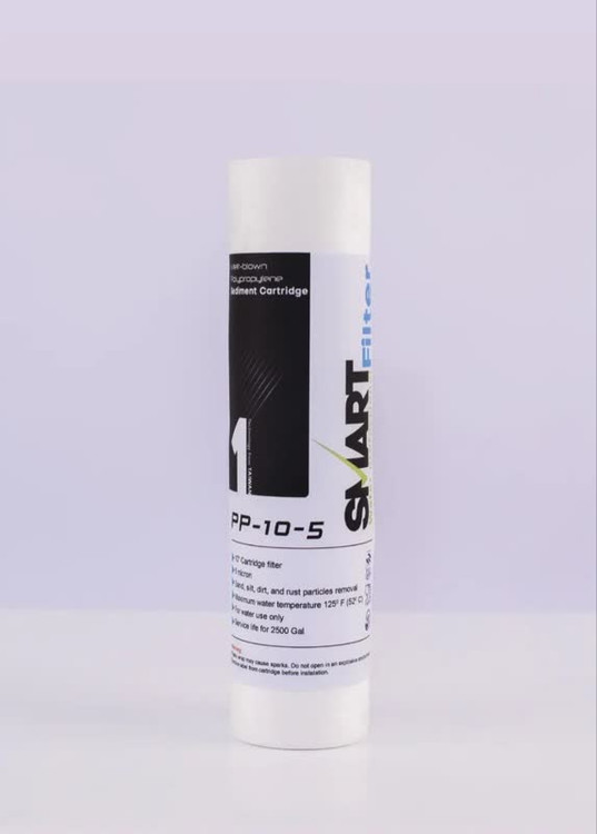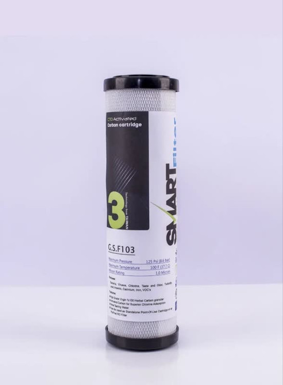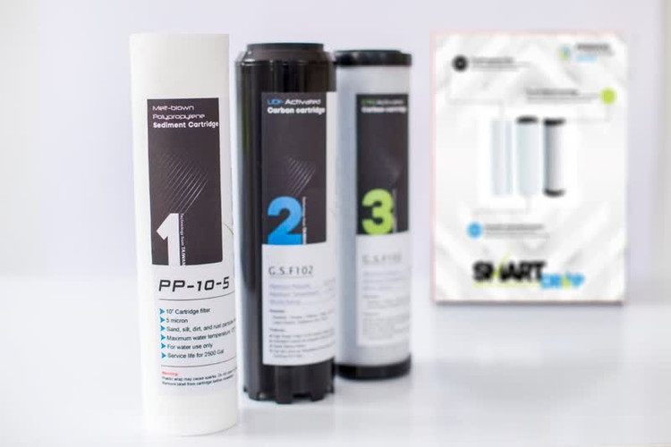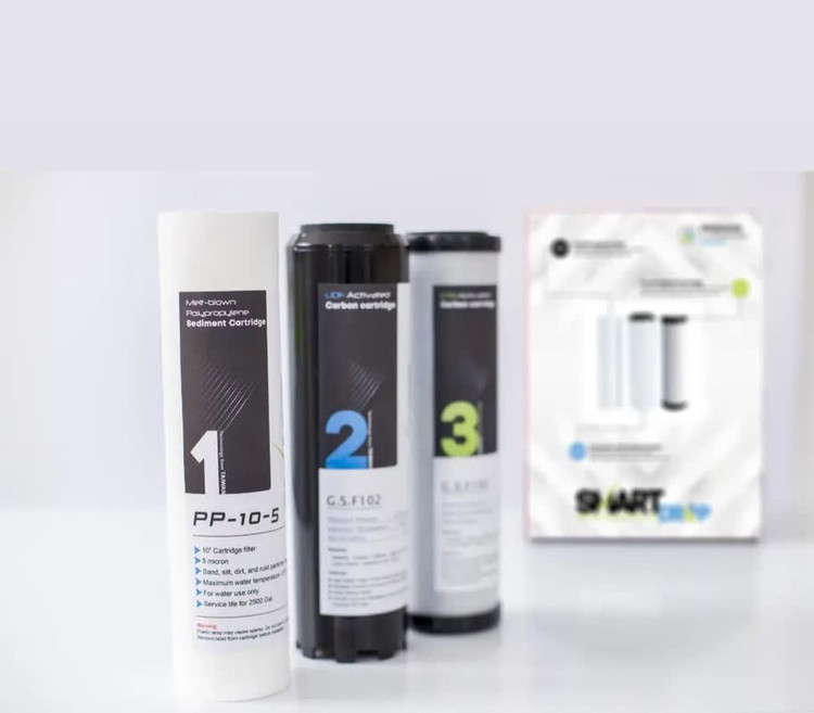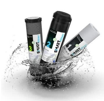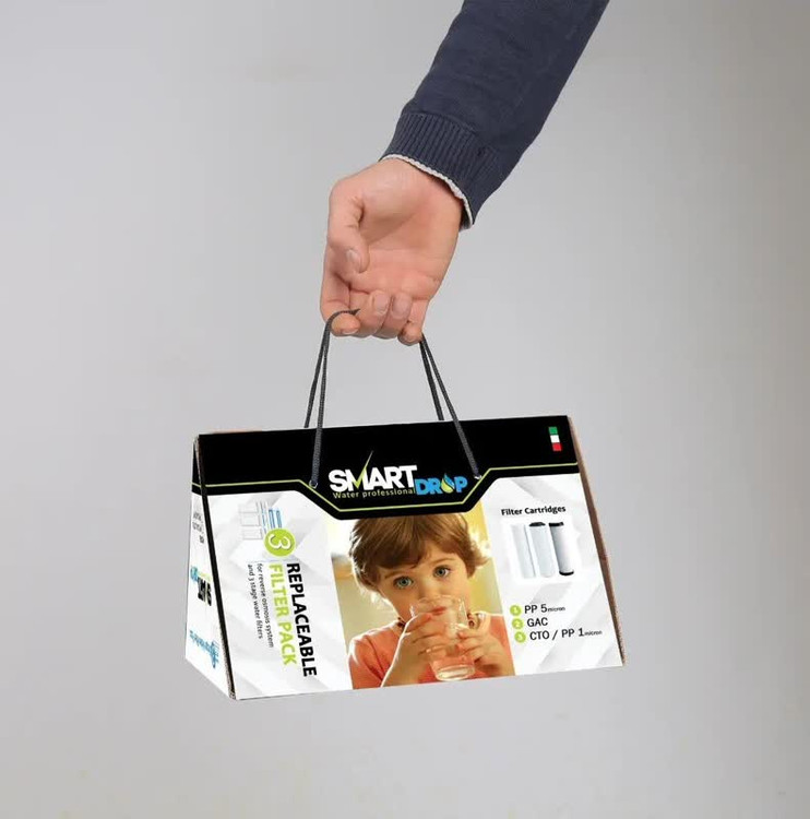 فیلتر تصفیه آب خانگی پک ۳ عددی برند اسمارت دراپ (SMART DROP) شامل: فیلتر مرحله یک، الیافی 5 میکرون، فیلتر مرحله دو ، کربن پودری یا UDF، فیلتر مرحله سه، الیافی 1 میکرون که در ایران تولید و ساخته شده است.