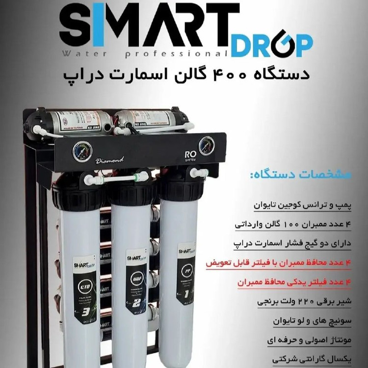 دستگاه تصفیه آب نیمه صنعتی 400 گالن اسمارت دراپ با پمپ و ترانس کوچین تایوانی، 4 ممبران و گیجهای فشار اسمارت دراپ، همراه با محافظهای ممبران و فیلترهای یدکی، تضمین میکند که آب شهری خانه شما به آب تمیز و خالصی تبدیل شود. همچنین با شیر برقی 220 ولت برنجی و سوئیچهای تایوانی، دستگاهی با کیفیت و اعتمادساز ارائه میدهد.