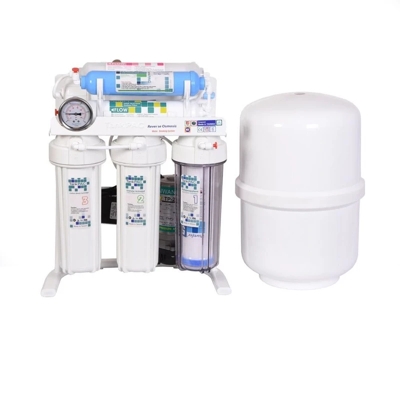 _دستگاه ۷مرحله ای تانک پک تایوانی دارای مخزن استاندارد ۱۹لیتری با قدرت ۲۰۰لیتر آب در ۲۴ ساعت تکنولوژی اسمز معکوس اندازه فیلتراسیون ۰۰۰.۰۱ میکرون ۱۲ماه گارانتی تأییدیه فیلترها وتجهیزات از سازمان بهداشت USA استفاده از بهترین مواد پلاستیکی در ساخت بدنه حذف تمام املاح مضر،گل و لای،ذرات معلق و کلر حذف فلزات سنگین و رسوبات حذف ویروس ها و میکروب ها،باکتری ها و قارچ ها